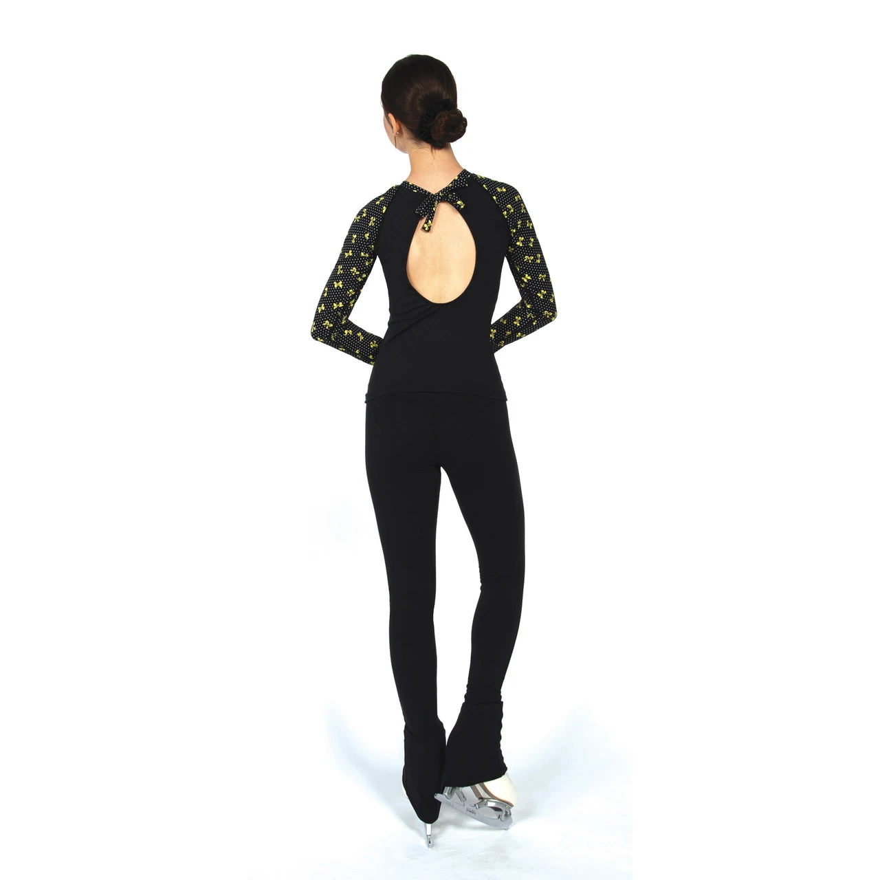 Black supplex top with honey bow print sleeves and a keyhole back with tie detail at the neck.