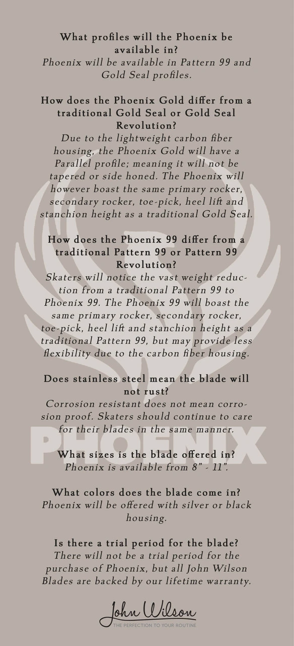 This feature allows the John Wilson Phoenix Gold to be the lightest blade on the market without any loss in strength, giving you savings in energy and more time in the air. This is officially the lightest blade ever made and showcases a full carbon fiber body with a stainless-steel runner. The stainless steel we’ve selected will outperform anything we have offered before in its ability to resist corrosion while providing extended edge life. Perfectly designed to provide improved performance, this innovative blade design will allow athletes around the world to reach unprecedented technical heights. The skater with the competitive advantage is the one with the best technology.